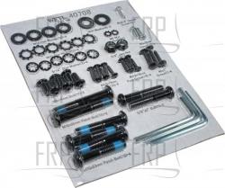 BOM Qty | 1 | Screw | 2 | 2 | Washer | 6 | 3 | Nut, Nylock | 3 | 4 | Washer, Flat | 2 | 5 | M10 JAM NUT | 2 | 6 | M4 GROUND BOLT | 1 | 7 | Screw | 4 | 8 | Washer, Locking | 6 | 9 | Screw | 2 | 10 | Screw | 15 | 11 | SCREW,ABPHPNHSMS,TZP,#8X.750" | 1 | 12 | Washer, Star | 2 | 13 | SCREW, M5-0.8 X 16MM | 2 | 14 | Screw | 6 | 15 | Bolt | 2 | 16 | Washer | 4 | 17 | Screw | 6 | 18 | Bolt, Patch | 4 | 19 | Nut, Nylock Hex | 5 | 20 | Nut | 1 | 21 | Fastener, Cushion, Platform | 4 | 22 | Hex Nut | 2 | 23 | Nut, Locking | 2 | 24 | Screw | 2 | 25 | Screw | 1 | 26 | SCREW,HHCS,GR8,BPO,3/8-16X1.25 | 1 | 27 | Screw | 2 | 28 | Screw | 2 | 29 | Screw | 3 | 30 | Screw | 12 | 31 | Screw | 4 | 32 | Screw | 4 | 33 | Screw | 2 | 34 | Bolt, Tension | 2 | 35 | Washer, Star | 2 | 36 | Washer, Star, Roller, Front | 2 | 37 | Washer, Flat | 2 | 38 | Screw | 6 | 39 | Washer, Star | 4 | 40 | MOTOR PIVOT BOLT | 1 | 41 | CAGE NUT | 6 | 42 | U-Nut | 4 | 43 | Screw | 4 | 44 | BKT,RR RLR,ARPS,RT | 1 | 45 | DUST COVER SCREW | 1 | 46 | Screw | 4 | 47 | Cushion, Platform, Right | 1 | 48 | Tool, Belt Adjustment | 1 | 49 | Magnet | 1 | 50 | LEFT FOOT RAIL | 1 | 51 | NLA ISLATR,RBBR,Black | 2 | 52 | Cushion, Platform, Left | 1 | 53 | Guide, Belt | 2 | 54 | Spacer | 2 | 55 | Speed sensor | 1 | 56 | Retainer Clamp | 1 | 57 | End Cap, Rectangle, Internal | 2 | 58 | FRONT ROLLER/PULLEY | 1 | 59 | Belt, Drive | 1 | 60 | CMPT,FILTER,EMI 210461- | 1 | 61 | Cable Tie, Mounting | 4 | 62 | LATCH,CATCH,Assembly,TELESCOPE | 1 | 64 | RIGHT FOOT RAIL | 1 | 65 | WALKING PLATFORM | 1 | 66 | Treadbelt | 1 | 68 | BKT,RR RLR,ARPS,LT | 1 | 69 | REAR ROLLER | 1 | 70 | Foot, Rear, Right | 1 | 71 | Foot, Rear, Left | 1 | 72 | MOTOR HOOD | 1 | 73 | Wire Harness | 1 | 74 | MTR,AC,LIFT,PUSH | 1 | 75 | Frame, Incline | 1 | 76 | Controller, MC2100 | 1 | 77 | Plate, Electronics | 1 | 78 | Transformer | 1 | 79 | 8" GREEN WIRE F/R | 1 | 80 | Isolator, Motor | 1 | 81 | MTR,2.80HP,W/FW,WO/BKT,ARPS | 1 | 82 | Bushing, Plastic | 2 | 83 | MOTOR BRACKET | 1 | 84 | Adapter, Plug | 1 | 85 | Power Cord, European | 1 | 86 | BELLY PAN | 1 | 87 | 8" GRN/YLLW WIRE,F/R | 1 | 88 | RECEPTICAL | 1 | 89 | RESET/OFF CIRCUIT BREAKER | 1 | 90 | Grommet, Strain Relief | 2 | 91 | ENDCAP,HB,L/R,Black | 2 | 92 | LEFT HANDRAIL | 1 | 93 | ENDCAP,CNSL,LT,URGBY | 1 | 94 | RIGHT HANDRAIL | 1 | 95 | ENDCAP,CNSL,RT,URGBY | 1 | 96 | LEFT UPRIGHT | 1 | 97 | WIRE,HRNS,060" | 1 | 98 | RIGHT UPRIGHT | 1 | 99 | Spacer | 2 | 100 | Bumper, Leveler | 4 | 101 | Base, Upright | 1 | 102 | Spacer, Wheel | 4 | 103 | Wheel | 2 | 105 | Cable Tie | 16 | 106A | Decal,Warning | 1 | 106B | Decal, Warning | 1 | 106C | DECAL,WARN,5LANG,LATCH | 1 | 107A | Decal, Caution, English | 2 | 107B | Decal, Caution | 2 | 107C | Decal, Caution | 2 | 108 | Tool, Wrench | 1 | 109 | CONSOLE | 1 | 110 | CONSOLE CROSSBAR | 1 | 111 | Safety key | 1 | 112 | Tool, Allen wrench | 1 | 113 | Nut, Locking | 1 | 114 | Wrench, Allen | 1 | | 8" GREEN/YELLOW WIRE, F/R | 1 | | Decal,Warning | 1 | | Decal, Warning | 1 | | DECAL,WARN,5LANG,LATCH | 1 | | Decal, Caution, English | 2 | | Decal, Caution | 2 | | Decal, Caution | 2 | | 8" GREEN/YELLOW WIRE, F/R | 1 | | WIRE,JMPR,008",Black,M/F 135651D | 1 | | WIRE,JMPR,010",RED,M/F 135651G | 1 | | WIRE,JMPR,008",White,F/F 224971A | 1 | | WIRE,JMPR,012",White,F/F 130424F | 1 | | WIRE,JMPR,006",BLU,F/F 130424F | 1 | | 8" BLUE WIRE, 2F | 1 | | WIRE,JMPR,014",BLU,M/F | 1 | | WIRE,JMPR,004",Black,F/F 130424F | 1 | | Grease, packet | 1 | | TECH SHEET | 1 | | Envelope | 1 | | USER'S MANUAL, SPANISH | 1 | | USER'S MANUAL, PORTUGUESE | 1 | | LITPAC, NOTE: | 1 | | Hardware Kit | 1 | | Accessory Kit | 1 | | Lubricant, Treadbelt | 1 | | Kit, Lube | 1 | |